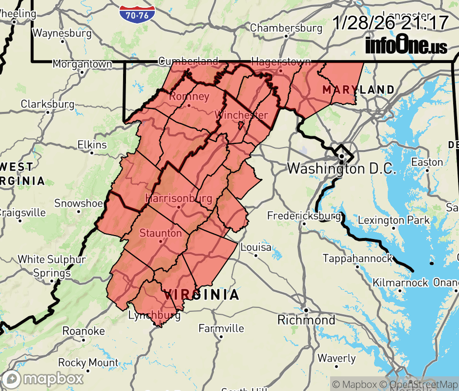 Canceled 1/28/26 11:10 PM Cold Weather Advisory issued January 28 at 9:16PM EST until January 29 at 11:00AM EST by NWS Baltimore MD/Washington DC * WHAT... For the Cold Weather Advisory, very cold wind chills as low as 13 below zero expected. * WHERE... Portions of north central and western Maryland, central, northwest, and western Virginia, and eastern and panhandle West Virginia. * WHEN... Until 11 AM EST Thursday. * IMPACTS... The cold wind chills as low as 13 below zero could result in hypothermia if precautions are not taken. Frostbite and hypothermia will occur if unprotected skin is exposed to these temperatures. Wind chill values can lead to hypothermia with prolonged exposure. * ADDITIONAL DETAILS... Additional Cold Weather Headlines are expected at times through the end of the week as the region remains in an Arctic airmass. ![]() |