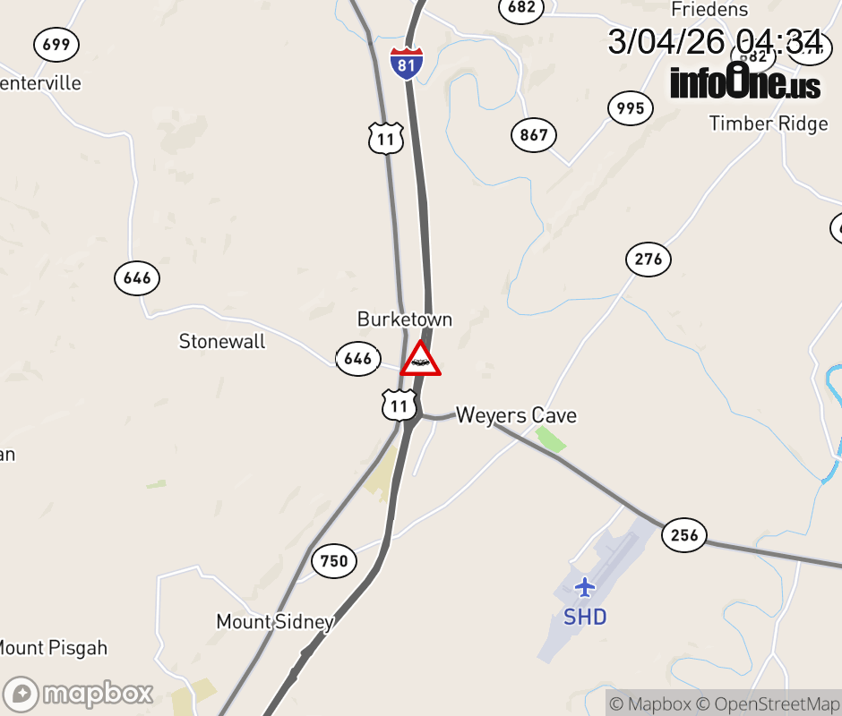 On I-81 at mile marker 235.8 in the County of Augusta, motorists can expect delays due to a tractor trailer crash. The south right shoulder is closed. ![]() |