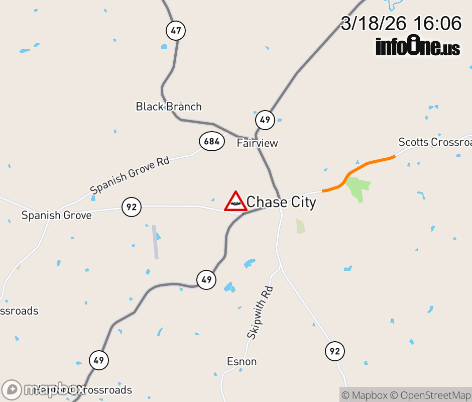 On City Rt. 4 East in the Town of Chase City, in the vicinity of Bailey Dr; Blankenship Rd; Rt. 600E/W (Mecklenburg County); County/City/Town Line, CHASE CITY/ MECKLENBURG, motorists can expect delays due to a vehicle crash. Updated: Wed 3/18/26 4:06 PM EDT ![]() Updated: Wed 3/18/26 4:06 PM EDT |