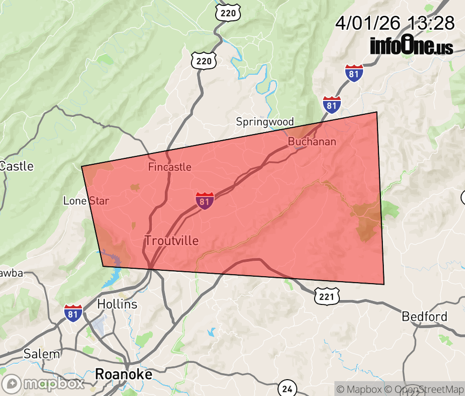 Canceled 4/1/26 2:00 PM Special Weather Statement issued April 1 at 1:27PM EDT by NWS Blacksburg VA At 127 PM EDT, Doppler radar was tracking a strong thunderstorm over Daleville, or over Troutville, moving east at 25 mph. HAZARD...Wind gusts up to 40 mph and pea size hail. SOURCE...Radar indicated. IMPACT...Gusty winds could knock down tree limbs and blow around unsecured objects. Locations impacted include... Buchanan... Troutville... Montvale... Fincastle... Nace... Arcadia... and Daleville. ![]() |