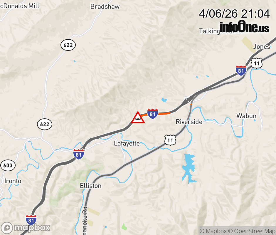 On I-81 North at mile marker 130.4 in the County of Montgomery, motorists can expect delays due to a tractor trailer crash. Traffic backups are approximately 0.5 mile. Updated: Mon 4/6/26 9:04 PM EDT ![]() Updated: Mon 4/6/26 9:04 PM EDT |