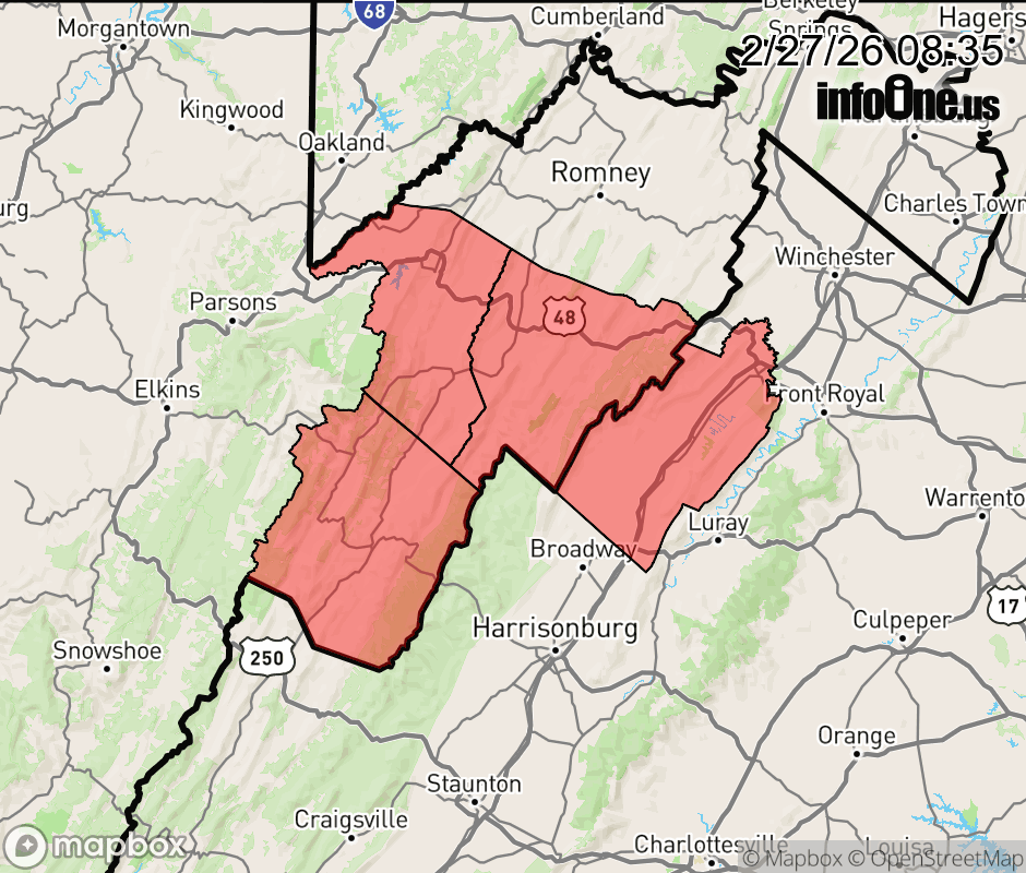 Canceled 2/27/26 9:18 AM Dense Fog Advisory issued February 27 at 8:33AM EST until February 27 at 11:00AM EST by NWS Baltimore MD/Washington DC * WHAT... Visibility one quarter mile or less in dense fog. * WHERE... In Virginia, Shenandoah County. In West Virginia, Eastern Grant, Eastern Pendleton, and Hardy Counties. * WHEN... Until 11 AM EST this morning. * IMPACTS... Low visibility could make driving conditions hazardous. ![]() |
