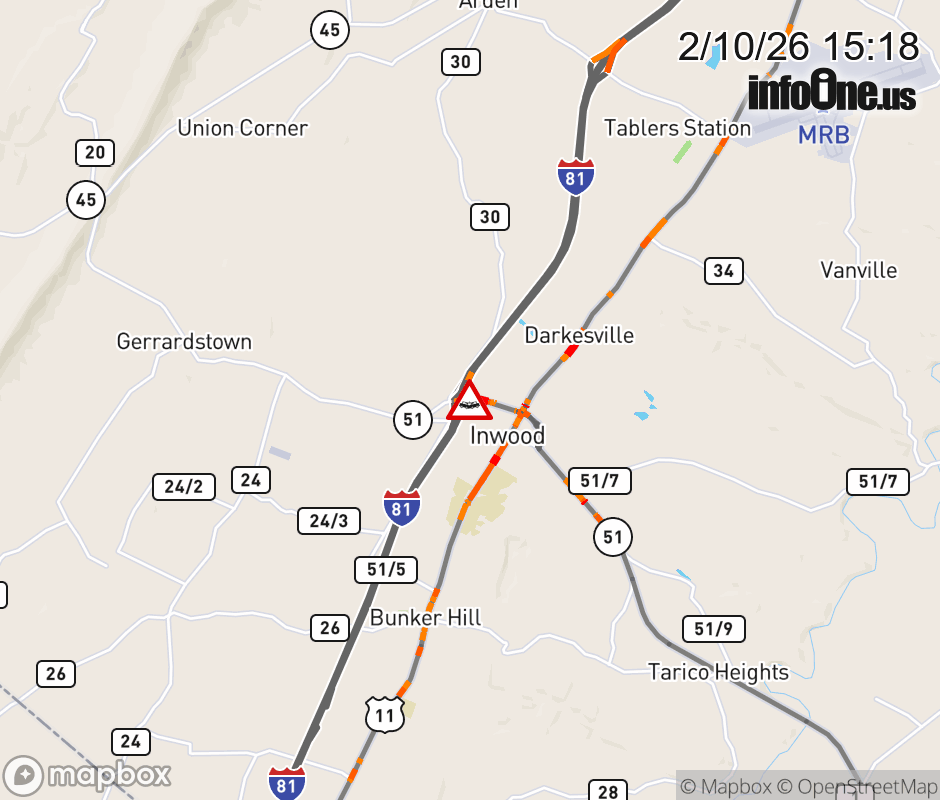 Vehicle Crash on WV-51 (4700 Gerrardstown Road). The eastbound road is closed. Updated: Tue 2/10/26 3:18 PM EST ![]() Updated: Tue 2/10/26 3:18 PM EST |