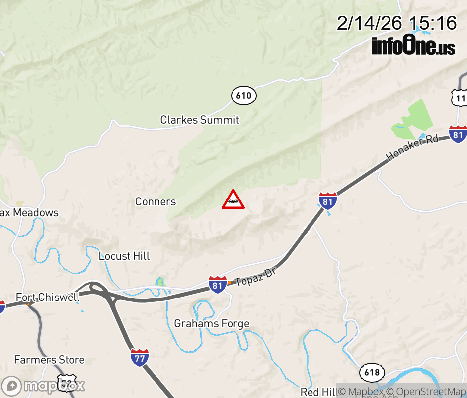 On Rt. 726 East in the County of Wythe, in the vicinity of Dead End, motorists can expect delays due to a vehicle crash. Lane closures exist. Updated: Sat 2/14/26 3:16 PM EST ![]() Updated: Sat 2/14/26 3:16 PM EST |