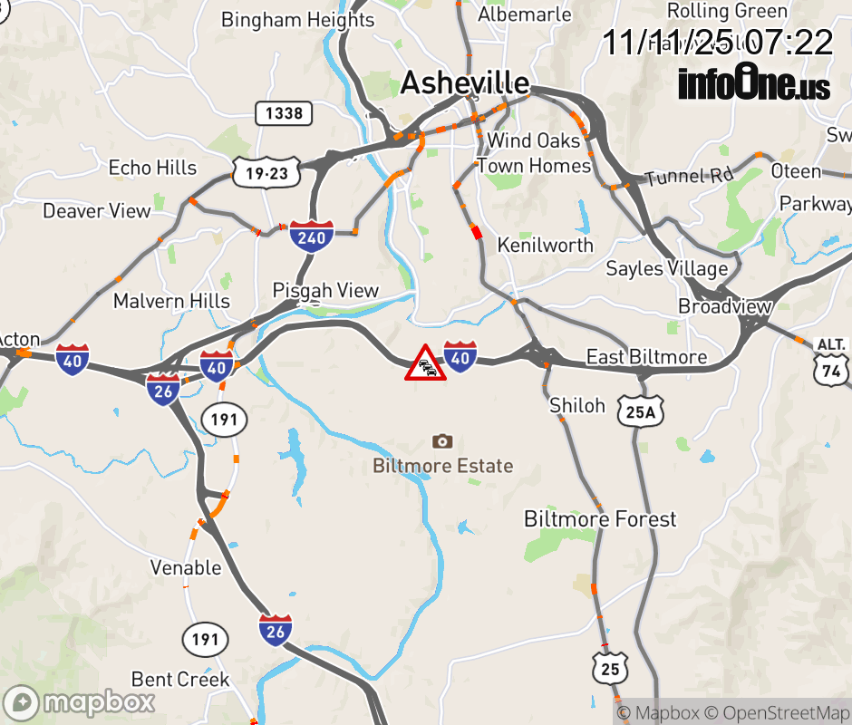 The right lane is closed 1.5 miles west of Exit 50, US 25 (Hendersonville Road). ![]() |