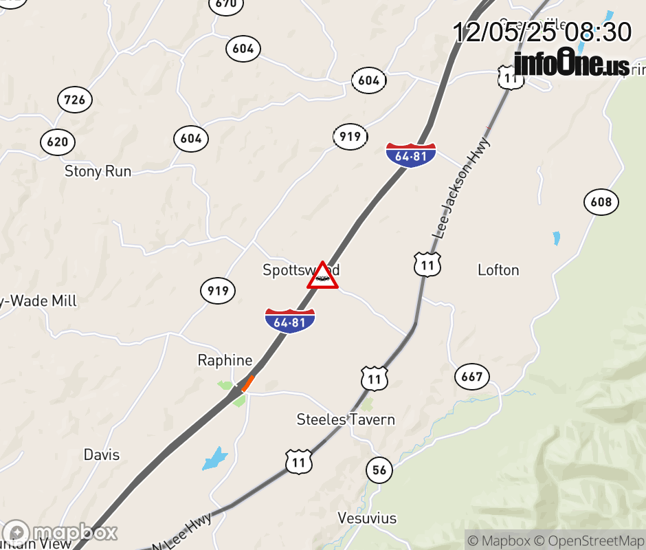 On I-81 at mile marker 207 in the County of Augusta, motorists can expect delays due to a tractor trailer crash. The south left shoulder, left lane, and right shoulder are closed. ![]() |