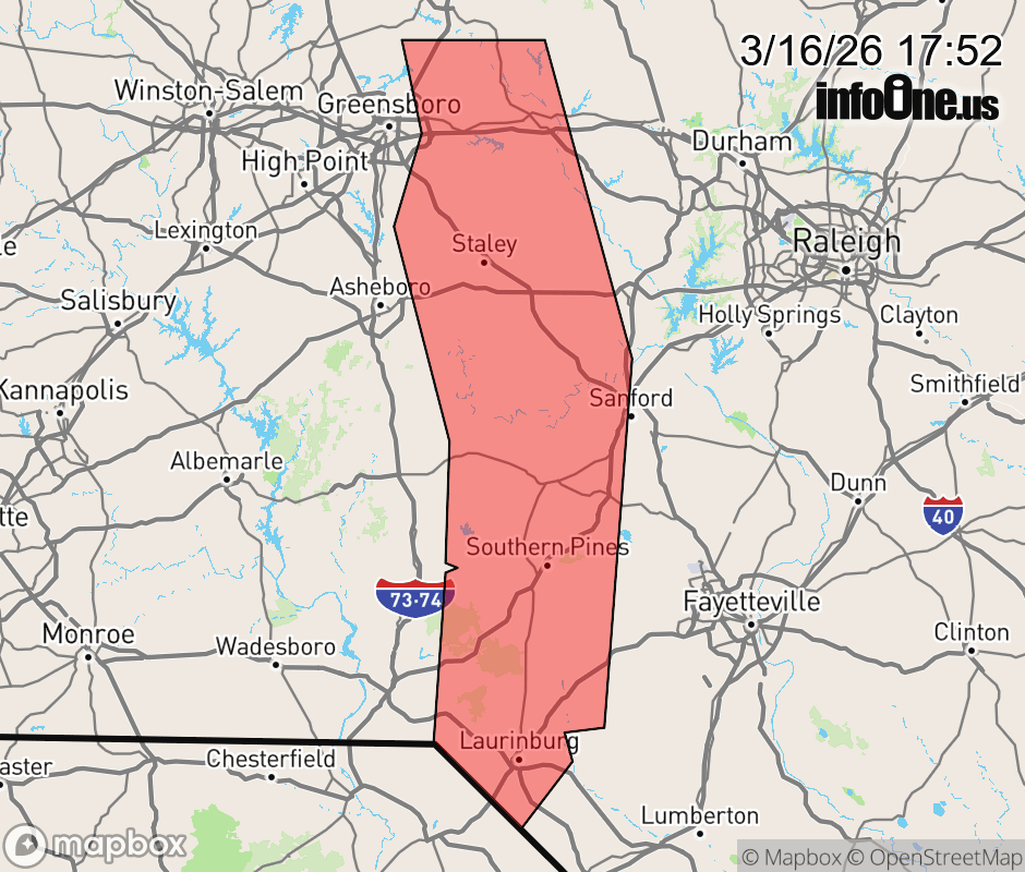 Canceled 3/16/26 6:10 PM Severe Thunderstorm Warning issued March 16 at 5:51PM EDT until March 16 at 6:15PM EDT by NWS Raleigh NC At 549 PM EDT, severe thunderstorms were located along a line extending from Monticello to Siler City to Hoffman, moving northeast at 50 mph. HAZARD...60 mph wind gusts. SOURCE...Radar indicated. IMPACT...Expect damage to roofs, siding, and trees. Locations impacted include... Burlington, Sanford, Laurinburg, Graham, Southern Pines, Raeford, Carthage, Siler City, Pinehurst, and Aberdeen. This includes the following highways... Interstate 85 between Mile Markers 129 and 131. Interstate 40 between Mile Markers 132 and 150, and between Mile Markers 225 and 226. US 1 near Mile Marker 69. ![]() |
