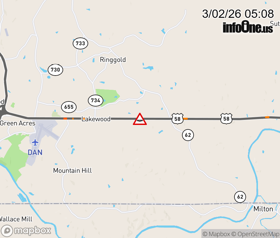 On US-58 in the County of Pittsylvania, in the vicinity of Albert Edmonds Dr; Rt. 985N/S (Pittsylvania County), motorists can expect delays due to a vehicle crash. The east right lane and right shoulder are closed. Updated: Mon 3/2/26 5:08 AM EST ![]() Updated: Mon 3/2/26 5:08 AM EST |