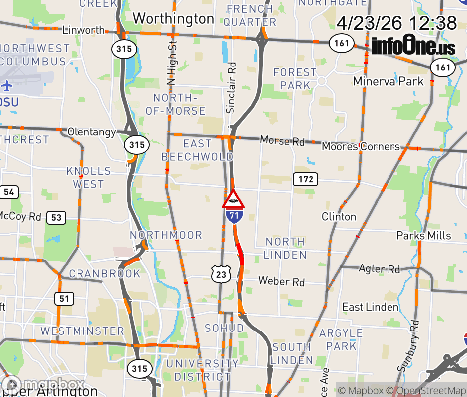 The right shoulder is blocked on I-71 North at E Cooke Rd, due to a crash. Updated: Thu 4/23/26 12:38 PM EDT ![]() Updated: Thu 4/23/26 12:38 PM EDT |