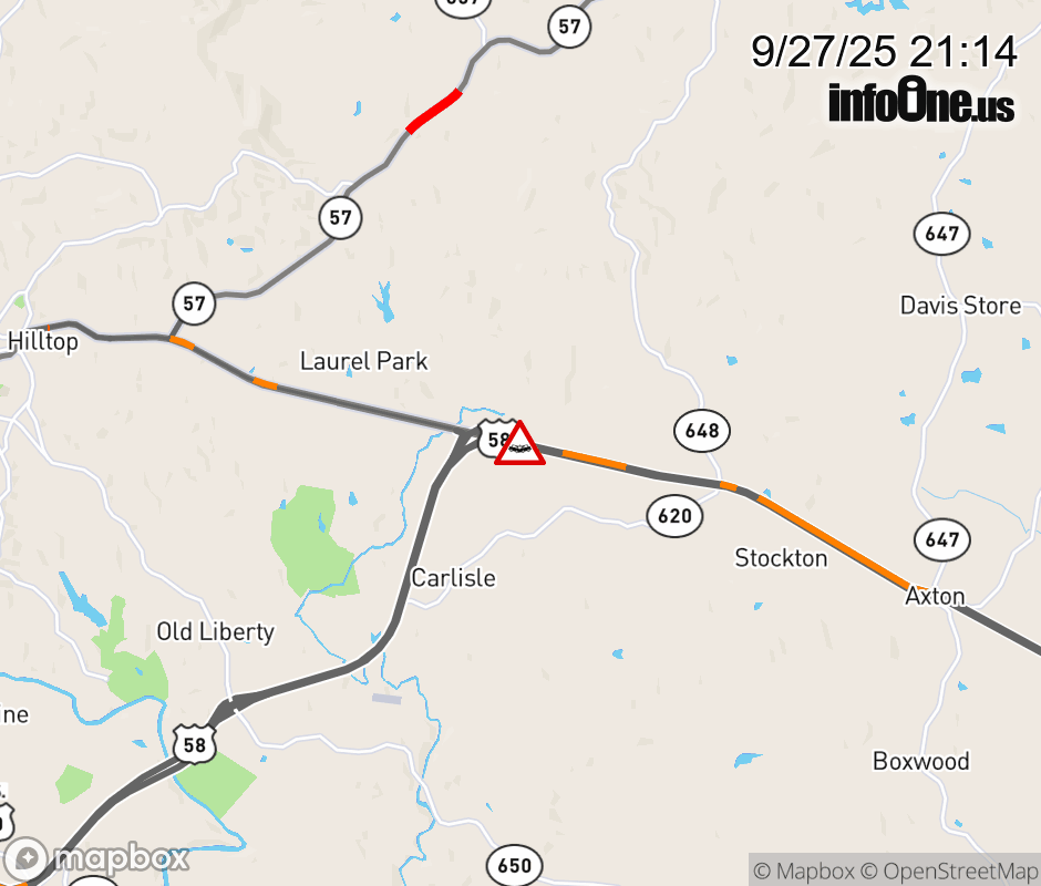 On US-58 West in the County of Henry, in the vicinity of A L Philpott Hwy; BUS US-58W (9 Martinsville/Henry); Ramp Intersection, motorists can expect delays due to a vehicle crash. Lane closures exist. ![]() |