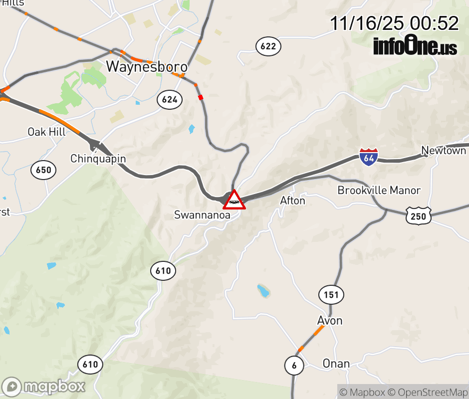 On I-64 West at mile marker 99.8 in the County of Augusta, motorists can expect delays due to a vehicle crash. Updated: Sun 11/16/25 12:52 AM EST ![]() Updated: Sun 11/16/25 12:52 AM EST |