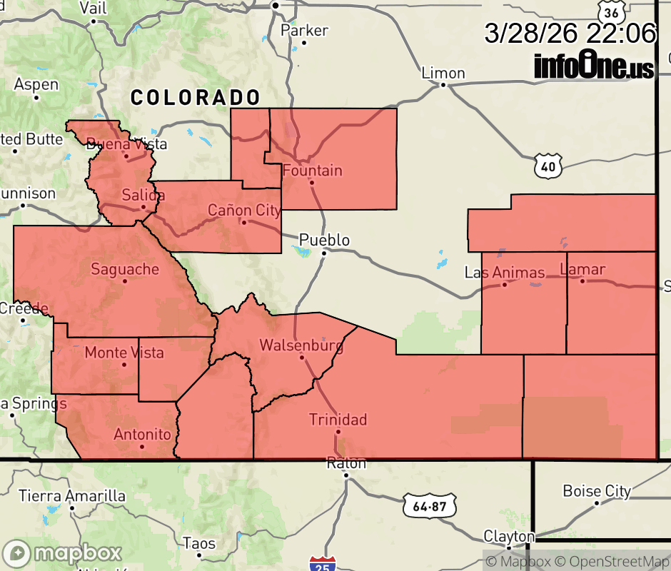 Canceled 3/29/26 3:24 AM Fire Weather Watch issued March 28 at 8:04PM MDT until March 30 at 8:00PM MDT by NWS Pueblo CO * AFFECTED AREA... Fire Weather Zones 221, 222, 224, 229, 230, 233, 234, 235, 236 and 237. * TIMING... From Monday morning through Monday evening. * WINDS... West 15 to 25 mph with gusts up to 45 mph. * RELATIVE HUMIDITY... As low as 8 percent. * IMPACTS... Elevated fire danger is expected. Fires will catch and spread rapidly and erratically. ![]() |