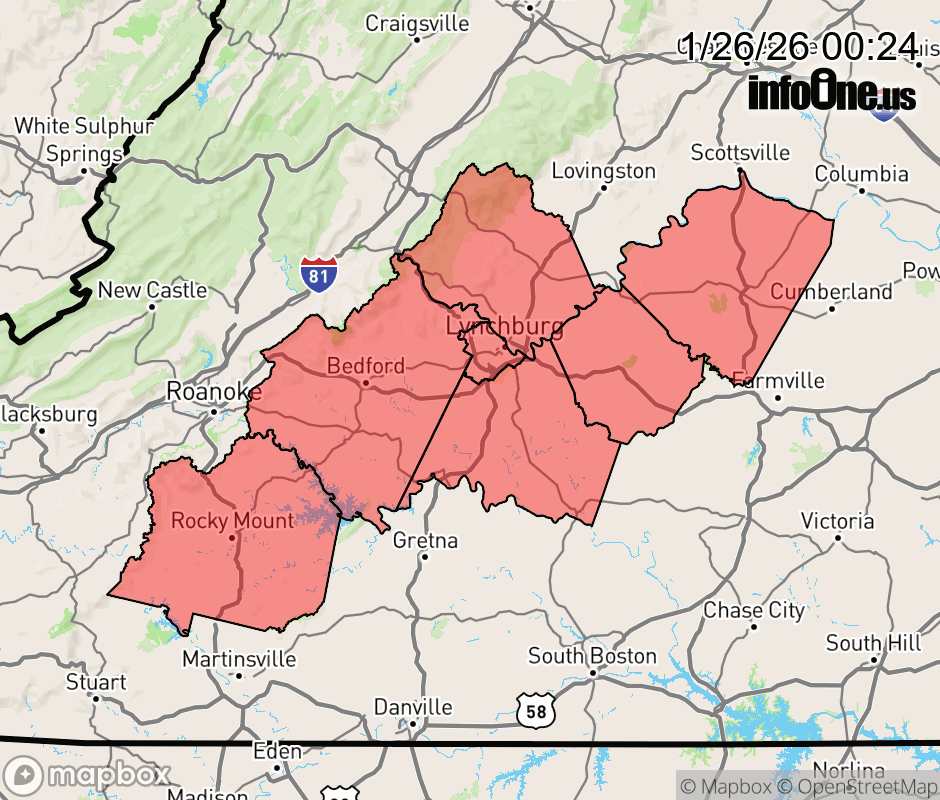 Canceled 1/26/26 4:11 AM Cold Weather Advisory issued January 26 at 12:22AM EST until January 27 at 12:00PM EST by NWS Blacksburg VA * WHAT... Very cold wind chills as low as 10 below expected. * WHERE... Amherst, Appomattox, Buckingham, Campbell, Bedford, and Franklin Counties. * WHEN... From 6 PM this evening to noon EST Tuesday. * IMPACTS... The cold wind chills as low as 10 below zero could result in hypothermia if precautions are not taken. ![]() |