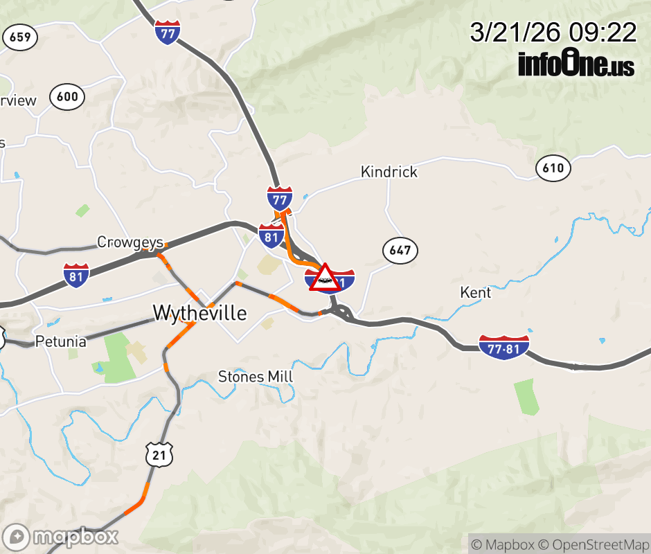 On I-81 at mile marker 73.5 in the County of Wythe, motorists can expect delays due to a tractor trailer crash. The north right shoulder is closed. Updated: Sat 3/21/26 9:22 AM EDT ![]() Updated: Sat 3/21/26 9:22 AM EDT |