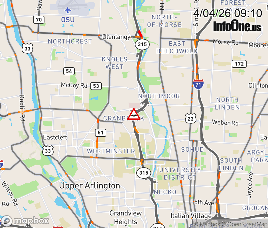 Expect lane closures on SR-315 North at N Broadway/Olentangy River Rd, due to a crash. ![]() |