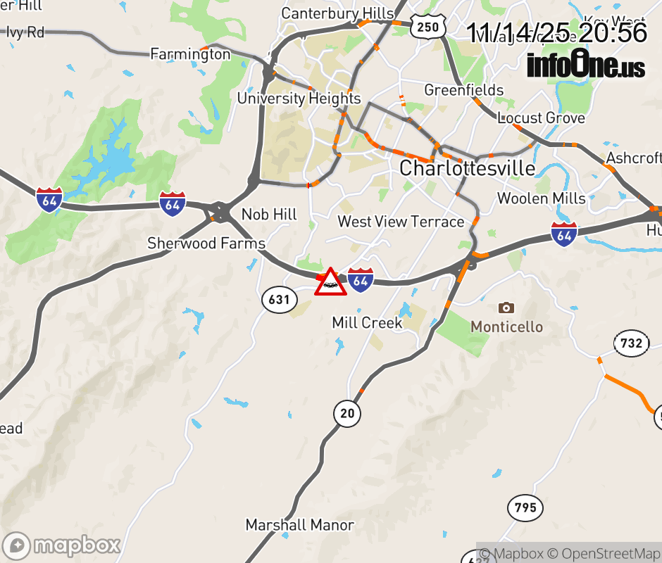 On Rt. 631 in the County of Albemarle, in the vicinity of Crossover; E I64 Exit 120 Off; I-64E Ramp 120A, motorists can expect delays due to a vehicle crash. All south lanes are closed. ![]() |