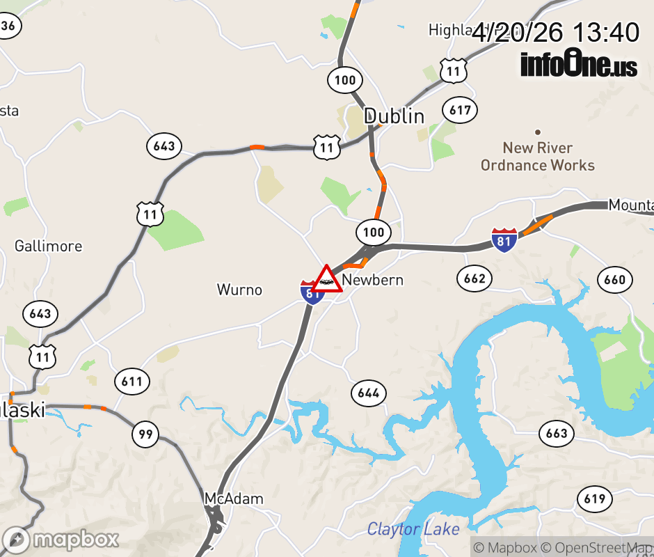 On I-81 at mile marker 98 in the County of Pulaski, motorists can expect delays due to a vehicle crash. The north entrance ramp narrows. Updated: Mon 4/20/26 1:40 PM EDT ![]() Updated: Mon 4/20/26 1:40 PM EDT |