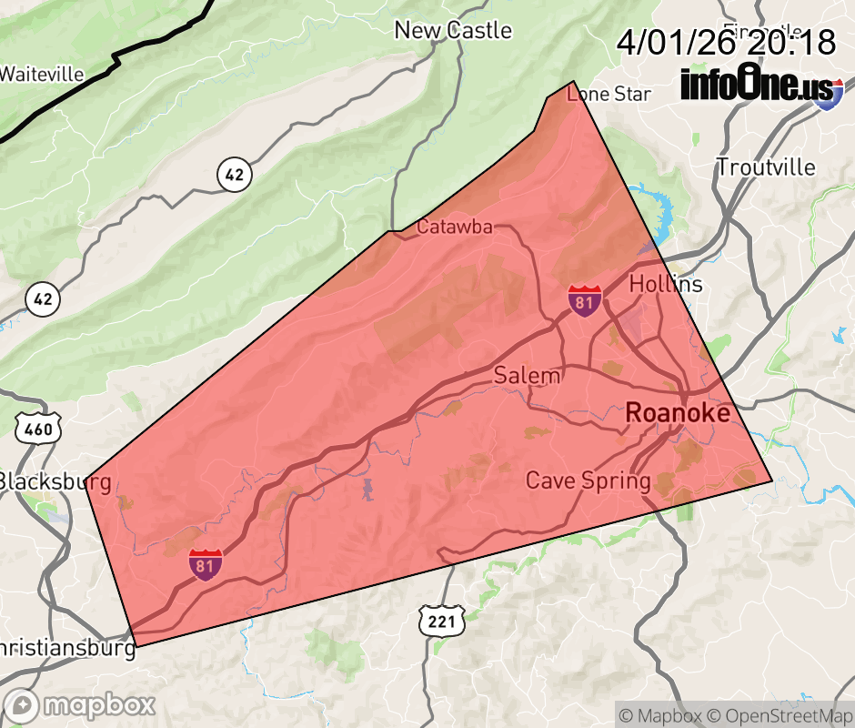Canceled 4/1/26 8:45 PM Special Weather Statement issued April 1 at 8:17PM EDT by NWS Blacksburg VA At 817 PM EDT, Doppler radar was tracking a strong thunderstorm near Elliston-Lafayette, or near Shawsville, moving northeast at 30 mph. HAZARD...Penny size hail. SOURCE...Radar indicated. IMPACT...Minor hail damage to vegetation is possible. Locations impacted include... Roanoke... Salem... Christiansburg... Vinton... Shawsville... Catawba... and Hollins. ![]() |
