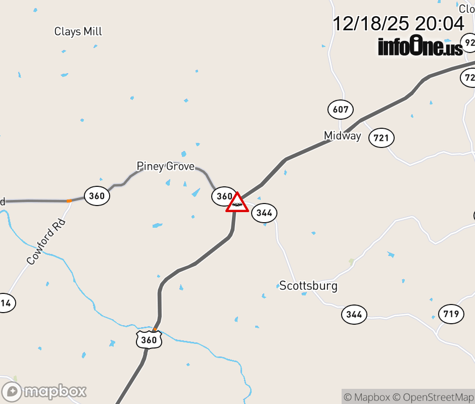 On US-360 in the County of Halifax, in the vicinity of Bethel Rd; Scottsburg Rd; VA-360E/W, motorists can expect delays due to a tractor trailer crash. All east lanes are closed. Updated: Thu 12/18/25 8:04 PM EST ![]() Updated: Thu 12/18/25 8:04 PM EST |