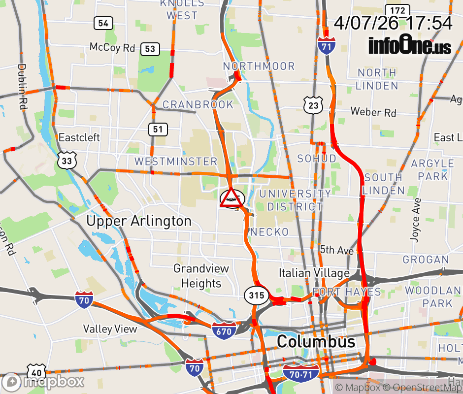 The right shoulder is blocked on SR-315 South at Kinnear Rd/Olentangy Rd, due to a crash. Updated: Tue 4/7/26 5:54 PM EDT ![]() Updated: Tue 4/7/26 5:54 PM EDT |