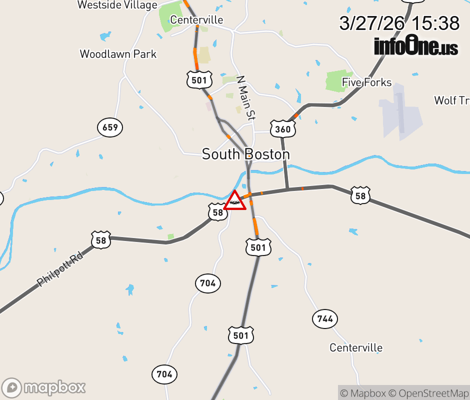 On US-58 West in the County of Halifax, in the vicinity of Old Cluster Springs Rd; Rt. 704N/S (Halifax County), motorists can expect delays due to a vehicle crash. Lane closures exist. ![]() |