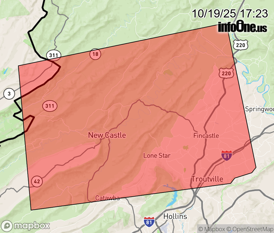 Canceled 10/19/25 5:45 PM Special Weather Statement issued October 19 at 5:20PM EDT by NWS Blacksburg VA At 520 PM EDT, Doppler radar was tracking a cluster of strong thunderstorms near New Castle, moving east at 35 mph. HAZARD...Wind gusts up to 50 mph. SOURCE...Radar indicated. IMPACT...Gusty winds could knock down tree limbs and blow around unsecured objects. Locations impacted include... Troutville... New Castle... Paint Bank... Sinking Creek... Catawba... Oriskany... and Fincastle. ![]() |