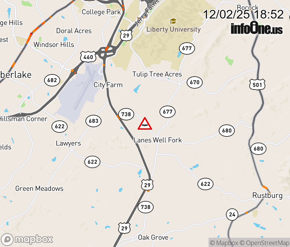 On Rt. 738 in the County of Campbell, in the vicinity of Sunnymeade Rd; Rt. 677N/S (Campbell County), motorists can expect delays due to a vehicle crash. All north lanes are closed. All south lanes are closed. Updated: Tue 12/2/25 6:52 PM EST ![]() Updated: Tue 12/2/25 6:52 PM EST |