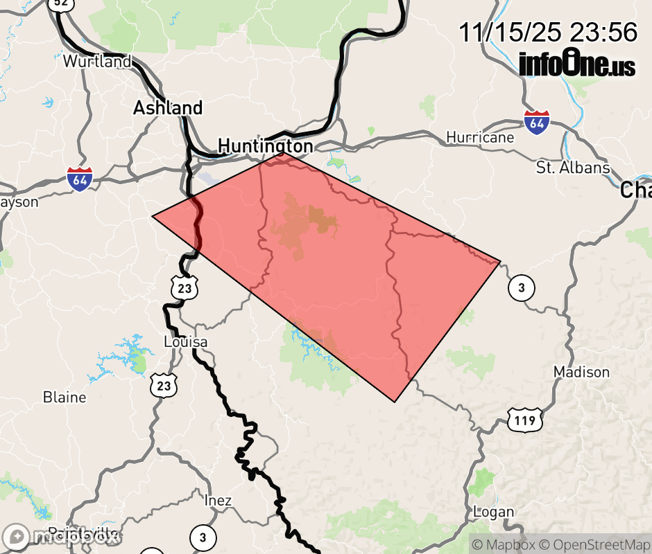 Canceled 11/16/25 12:30 AM Special Weather Statement issued November 15 at 11:55PM EST by NWS Charleston WV At 1155 PM EST, Doppler radar was tracking a strong thunderstorm near Huntington, moving southeast at 40 mph. HAZARD...Wind gusts of 50 to 55 mph. SOURCE...Radar indicated. IMPACT...Gusty winds could knock down tree limbs and blow around unsecured objects. Locations impacted include... Huntington, Wayne, Hamlin, Beech Fork State Park, Ranger, Gill, Durbin, East Lynn Lake, Burnaugh, Centerville, Harts, West Hamlin, Lockwood, Sweetland, Lavalette, Branchland, Palermo, Salt Rock, Griffithsville, and East Lynn. This includes Interstate 64 in West Virginia between mile markers 9 and 12. ![]() |