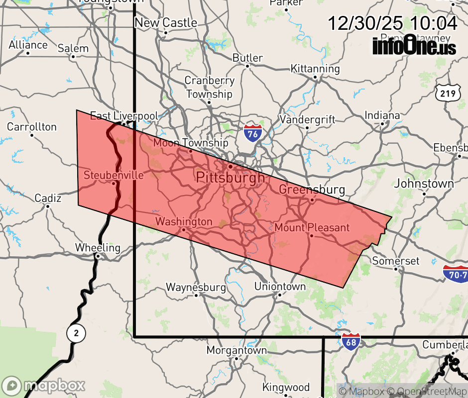 Canceled 12/30/25 11:30 AM Special Weather Statement issued December 30 at 10:03AM EST by NWS Pittsburgh PA At 1003 AM EST, Snow showers will continue this morning, and possibly result in snow-covered roads, and reduced visibility at some locations, making travel difficult. Locations impacted include... Portions of Interstate 70 and Interstate 79, Pittsburgh, Mount Lebanon, Bethel Park, Monroeville, Moon Township, McMurray, Greensburg, Weirton, McKeesport, Steubenville, Washington, Jeannette, Canonsburg, Latrobe, Connellsville, Wellsville, Wellsburg, Avella, Gastonville and West Mifflin. ![]() |