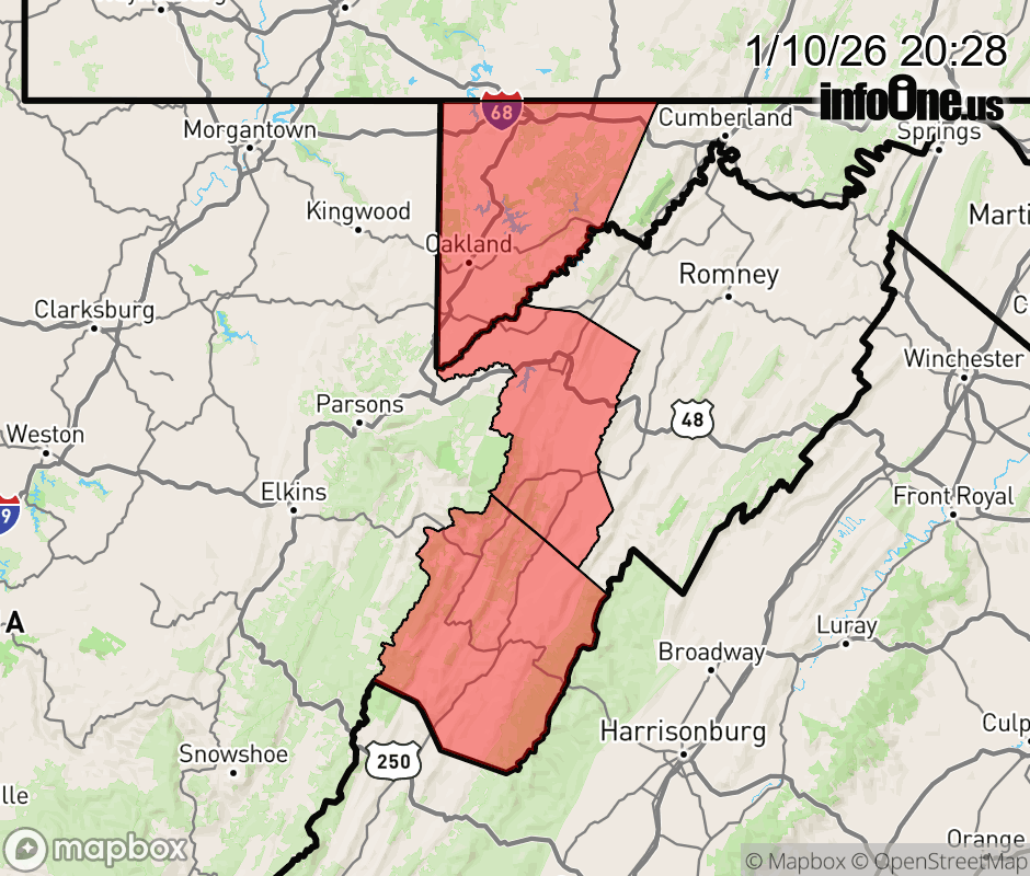Canceled 1/11/26 3:38 AM Winter Weather Advisory issued January 10 at 8:26PM EST until January 12 at 1:00AM EST by NWS Baltimore MD/Washington DC * WHAT... Upslope snow showers and squalls are expected late Sunday morning into Sunday night with total snow accumulations between 2 and 4 inches (locally higher amounts along western favored slopes). Winds will gust as high as 55 mph. Visibility will drop to one-quarter mile or less at times. Wind chills will fall into the single digits to 5 degrees below zero late Sunday afternoon into Sunday night. * WHERE... In Maryland, Eastern Garrett and Western Garrett Counties. In West Virginia, Western Grant and Western Pendleton Counties. * WHEN... From 8 AM Sunday to 1 AM EST Monday. * IMPACTS... Visibilities will drop below one-quarter mile at times due to falling and blowing snow. Near whiteout conditions are expected and will make travel treacherous and potentially life-threatening. Travel could be very difficult along the I-68/US-40 corridor west of La Vale, MD, US-48 corridor west of Moorefield, WV, US-33 west of Franklin, WV, and US-219 from the PA/MD line to WV line. The hazardous conditions will impact commuters Sunday into Sunday night. Gusty winds could bring down large tree branches. * ADDITIONAL DETAILS... The greatest concern for near-blizzard conditions is expected with the cold front late morning into early afternoon as well as a secondary round of upslope snow showers/squalls late afternoon into late evening. ![]() |