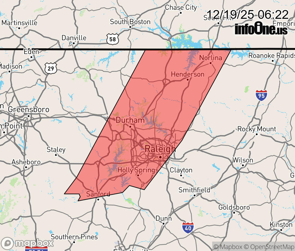 Canceled 12/19/25 6:44 AM Severe Thunderstorm Warning issued December 19 at 6:21AM EST until December 19 at 7:00AM EST by NWS Raleigh NC SVRRAH The National Weather Service in Raleigh has issued a * Severe Thunderstorm Warning for... Southeastern Person County in central North Carolina... Vance County in central North Carolina... Western Warren County in central North Carolina... Eastern Orange County in central North Carolina... Granville County in central North Carolina... Northern Lee County in central North Carolina... Wake County in central North Carolina... Durham County in central North Carolina... Chatham County in central North Carolina... Northwestern Franklin County in central North Carolina... * Until 700 AM EST. * At 621 AM EST, severe thunderstorms were located along a line extending from near Virgilina to near Rougemont to near Chapel Hill to 6 miles southwest of Pittsboro to near Goldston, moving east at 60 mph. HAZARD...60 mph wind gusts. SOURCE...Radar indicated. IMPACT...Expect damage to roofs, siding, and trees. * Locations impacted include... Raleigh, Durham, Cary, Chapel Hill, Sanford, Henderson, Oxford, Hillsborough, Creedmoor, and Pittsboro. This includes the following highways... Interstate 85 between Mile Markers 165 and 233. Interstate 40 between Mile Markers 261 and 301. Interstate 440 between Mile Markers 1 and 16. Interstate 540 between Mile Markers 0 and 21. US 1 between Mile Markers 69 and 101. the Durham Freeway between Mile Markers 2 and 17. ![]() |