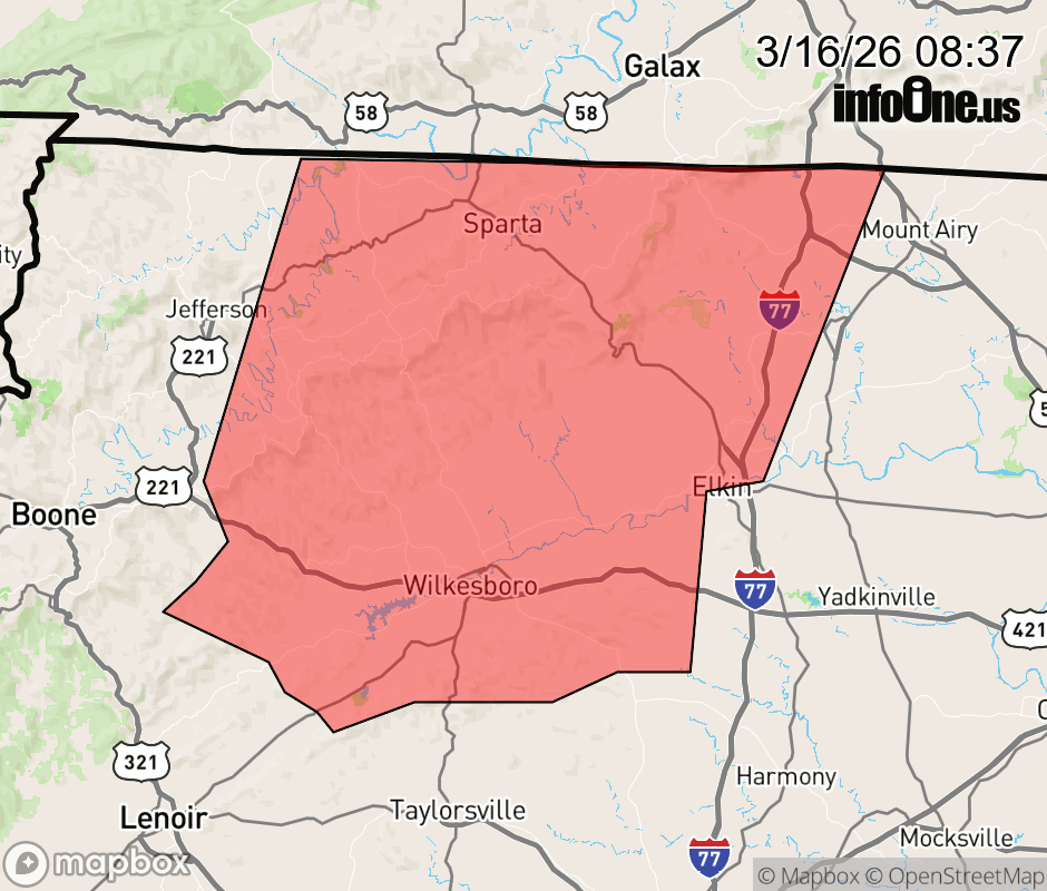 Canceled 3/16/26 9:01 AM Severe Thunderstorm Warning issued March 16 at 8:35AM EDT until March 16 at 9:30AM EDT by NWS Blacksburg VA SVRRNK The National Weather Service in BLACKSBURG has issued a * Severe Thunderstorm Warning for... Alleghany County in northwestern North Carolina... Western Surry County in northwestern North Carolina... Wilkes County in northwestern North Carolina... Eastern Ashe County in northwestern North Carolina... * Until 930 AM EDT. * At 835 AM EDT, severe thunderstorms were located along a line extending from Scottville to near Maple Springs, moving east at 40 mph. HAZARD...60 mph wind gusts. SOURCE...Radar indicated. IMPACT...Expect damage to roofs, siding, and trees. * Locations impacted include... North Wilkesboro... Elkin... Wilkesboro... Sparta... Dobson... Ronda... and Boomer. ![]() |