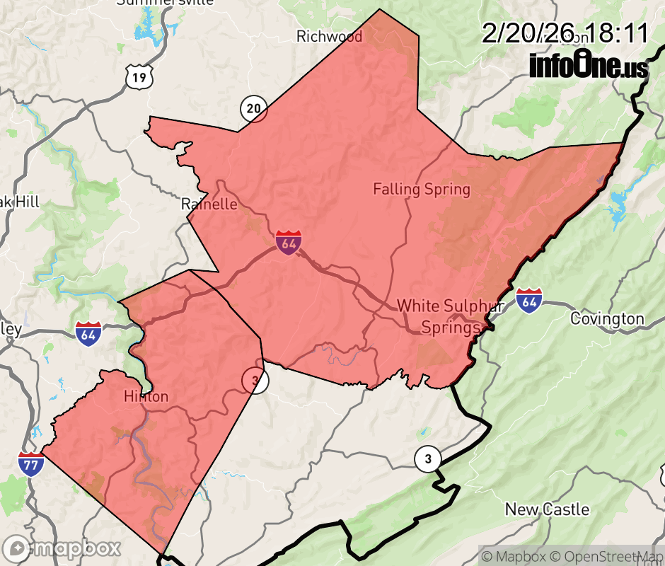 Canceled 2/21/26 2:23 AM Winter Storm Watch issued February 20 at 6:10PM EST until February 23 at 7:00PM EST by NWS Blacksburg VA * WHAT... Heavy snow possible. Total snow accumulations between 2 and 8 inches possible. Winds could gust as high as 40 mph. * WHERE... Summers and Western Greenbrier Counties. * WHEN... From late Saturday night through Monday evening. * IMPACTS... Travel could be very difficult. The hazardous conditions could impact the Monday morning and evening commutes. ![]() |