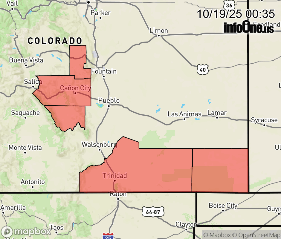Canceled 10/19/25 4:48 AM Frost Advisory issued October 18 at 10:34PM MDT until October 19 at 9:00AM MDT by NWS Pueblo CO * WHAT... Temperatures as low as 32 will result in frost formation. * WHERE... Eastern Las Animas, Baca, and Canon City Vicinity/Eastern Fremont County. * WHEN... Until 9 AM MDT Sunday. * IMPACTS... Frost could harm sensitive outdoor vegetation. Sensitive outdoor plants may be killed if left uncovered. ![]() |