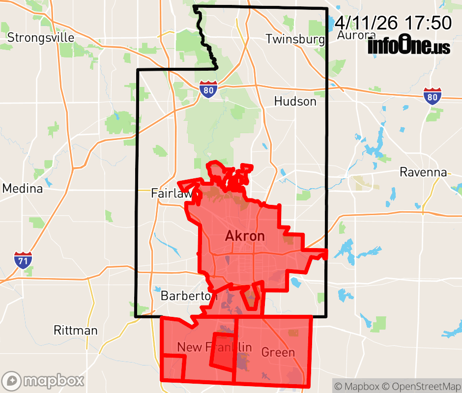 Canceled 4/11/26 6:10 PM Summit County has 2 power outages affecting 1476 customers. Ohio Edison 1476 without power New Franklin: Customers affected: 1497 (40%) Estimated repair: Sat 8:30 PM Green: Customers affected: 365 (3%) Estimated repair: Sat 8:30 PM Coventry Township: Customers affected: 334 (5%) Estimated repair: Sat 8:30 PM Clinton: Customers affected: 65 (9%) Estimated repair: Sat 8:30 PM Akron: Customers affected: 40 (< 1%) Estimated repair: Sat 8:30 PM Barberton: Customers affected: 19 (< 1%) Estimated repair: Sat 8:30 PM Updated: Sat 4/11/26 5:50 PM EDT ![]() Updated: Sat 4/11/26 5:50 PM EDT |