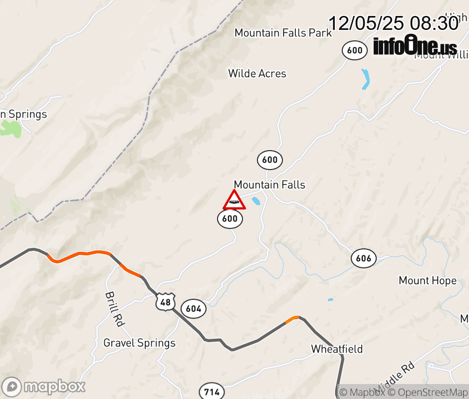 On Rt. 600 in the County of Frederick, in the vicinity of Wardensville Gr; Rt. 608N/S (Frederick County), motorists can expect delays due to a vehicle crash. All north lanes are closed. All south lanes are closed. ![]() |