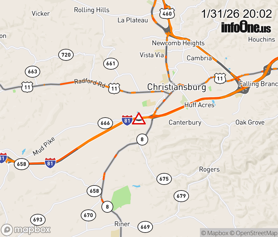 On I-81 at mile marker 113.9 in the County of Montgomery, motorists can expect delays due to a vehicle crash. The north left shoulder and left lane are closed. ![]() |