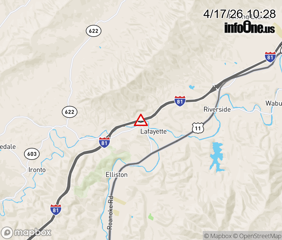 On I-81 at mile marker 129.5 in the County of Montgomery, motorists can expect delays due to a tractor trailer crash. The south right shoulder is closed. Updated: Fri 4/17/26 10:28 AM EDT ![]() Updated: Fri 4/17/26 10:28 AM EDT |
