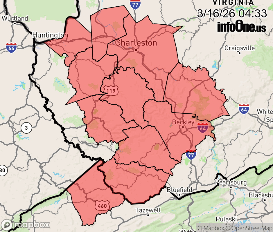 Canceled 3/16/26 7:00 AM Severe Thunderstorm Watch issued March 16 at 4:32AM EDT until March 16 at 7:00AM EDT by NWS Charleston WV THE NATIONAL WEATHER SERVICE HAS EXTENDED SEVERE THUNDERSTORM WATCH 62 TO INCLUDE THE FOLLOWING AREAS UNTIL 7 AM EDT THIS MORNING IN VIRGINIA THIS WATCH INCLUDES 1 COUNTY IN SOUTHWEST VIRGINIA BUCHANAN IN WEST VIRGINIA THIS WATCH INCLUDES 10 COUNTIES IN SOUTHERN WEST VIRGINIA BOONE FAYETTE KANAWHA LINCOLN LOGAN MCDOWELL PUTNAM RALEIGH WYOMING IN WESTERN WEST VIRGINIA CABELL THIS INCLUDES THE CITIES OF ALUM CREEK, BECKLEY, CHAPMANVILLE, CHARLESTON, DAVENPORT, FAYETTEVILLE, GARY, GRUNDY, HAMLIN, HARTS, HUNTINGTON, HURLEY, HURRICANE, LOGAN, MADISON, MAN, MULLENS, OAK HILL, OCEANA, PINEVILLE, SAINT ALBANS, SOUTH CHARLESTON, TEAYS VALLEY, VANSANT, WAR, AND WELCH. ![]() |