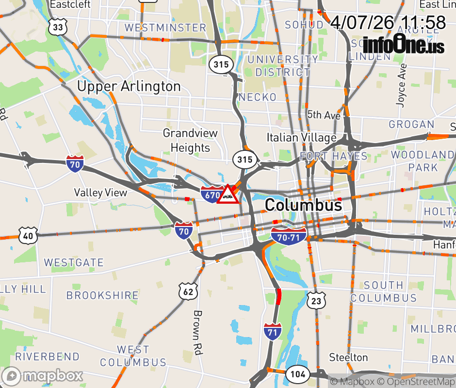 The right shoulder is blocked on I-670 West beyond SR-315 South, due to a disabled vehicle. Updated: Tue 4/7/26 11:58 AM EDT ![]() Updated: Tue 4/7/26 11:58 AM EDT |