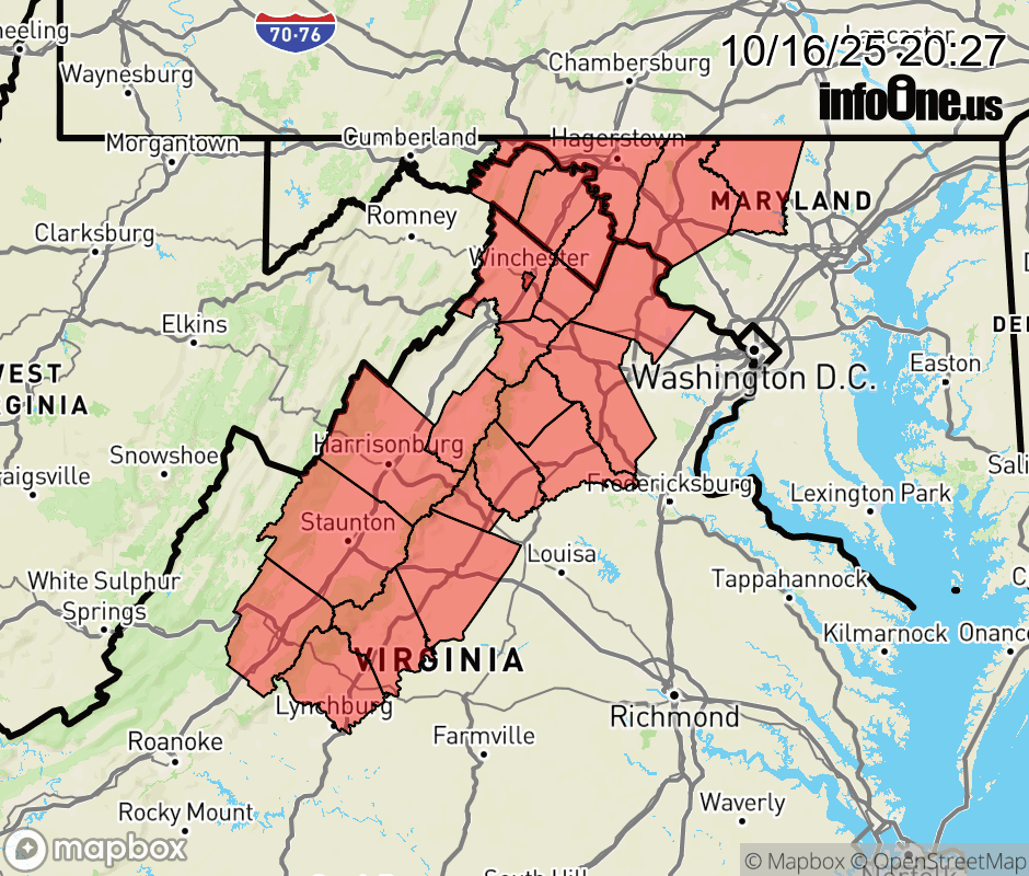 Canceled 10/17/25 4:03 AM Frost Advisory issued October 16 at 8:25PM EDT until October 17 at 9:00AM EDT by NWS Baltimore MD/Washington DC * WHAT... Temperatures as low as 32 will result in frost formation. * WHERE... Portions of north central Maryland, central, northern, and northwest Virginia, and panhandle West Virginia. * WHEN... From 2 AM to 9 AM EDT Friday. * IMPACTS... Frost could harm sensitive outdoor vegetation. Sensitive outdoor plants may be killed if left uncovered. ![]() |