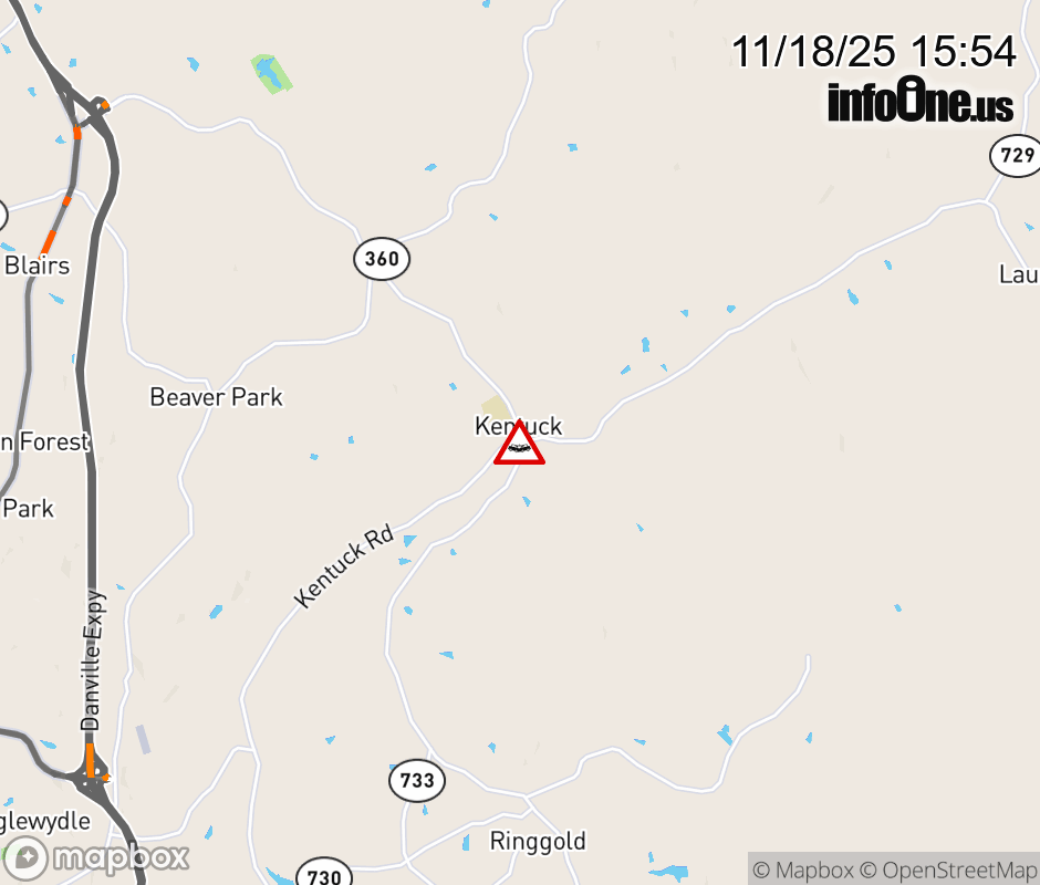 On Rt. 729 North in the County of Pittsylvania, in the vicinity of Kentuck Church Rd; Ringgold Church Rd; Rt. 726N/S (Pittsylvania County), motorists can expect delays due to a vehicle crash. Lane closures exist. ![]() |