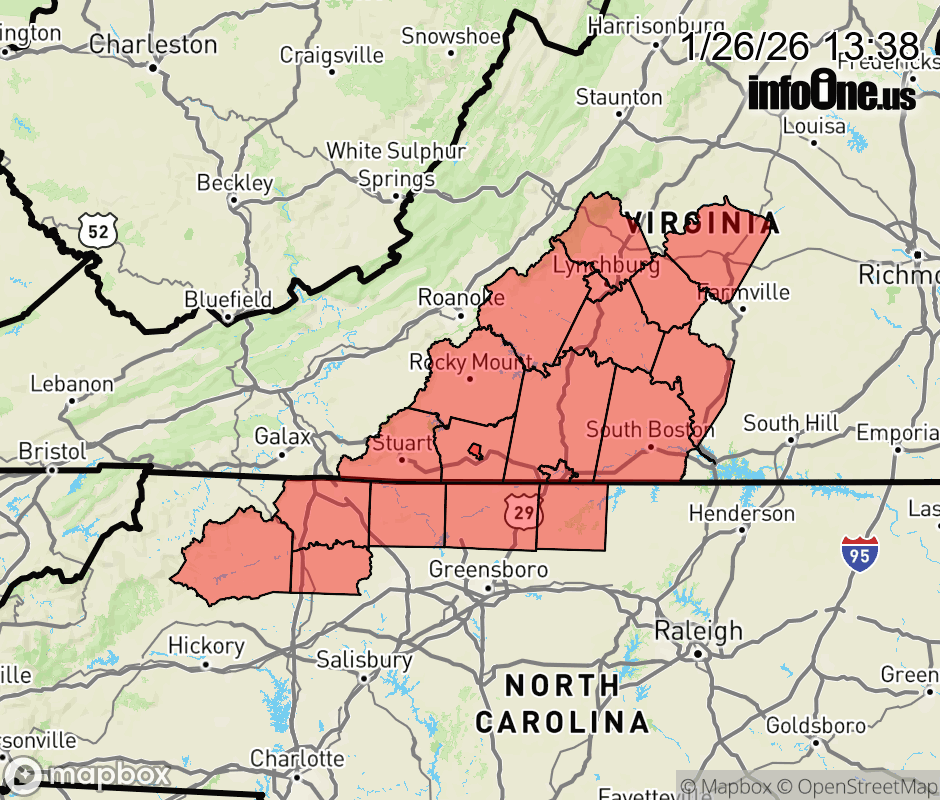 Canceled 1/26/26 6:37 PM Cold Weather Advisory issued January 26 at 1:36PM EST until January 27 at 12:00PM EST by NWS Blacksburg VA * WHAT... Very cold wind chills as low as 10 below expected. * WHERE... Portions of north central and northwest North Carolina and central, south central, southwest, and west central Virginia. * WHEN... From 6 PM this evening to noon EST Tuesday. * IMPACTS... The cold wind chills as low as 10 below zero could result in hypothermia if precautions are not taken. * ADDITIONAL DETAILS... In addition to the cold, continue to use extra caution if traveling. The persistent cold has prevented ice from melting off of untreated roads. ![]() |