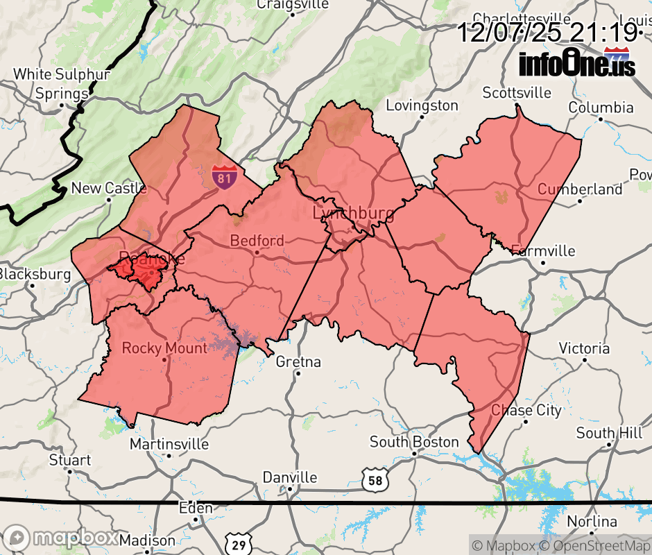 Canceled 12/8/25 6:32 AM Winter Storm Warning issued December 7 at 9:18PM EST until December 8 at 5:00PM EST by NWS Blacksburg VA * WHAT... Heavy snow expected. Total snow accumulations between 3 to 5 inches. * WHERE... Portions of central, south central, and west central Virginia. * WHEN... From 5 AM to 5 PM EST Monday. * IMPACTS... Roads, and especially bridges and overpasses, will likely become slick and hazardous. Plan on slippery road conditions. The hazardous conditions could impact the Monday morning and evening commutes. ![]() |