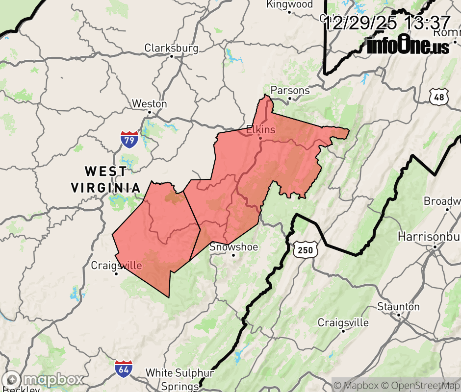 Winter Storm Watch issued December 29 at 1:36PM EST until January 1 at 10:00AM EST by NWS Charleston WV * WHAT... For the Winter Weather Advisory, snow expected. Total snow accumulations between 3 and 6 inches. Winds gusting as high as 60 mph. For the Winter Storm Watch, heavy snow possible. Total snow accumulations between 4 and 7 inches possible. Winds could gust as high as 45 mph. * WHERE... Northwest Randolph, Southeast Randolph, and Southeast Webster Counties. * WHEN... For the Winter Weather Advisory, until 1 PM EST Tuesday. For the Winter Storm Watch, from Wednesday afternoon through Thursday morning. * IMPACTS... Travel could be very difficult. The hazardous conditions could impact the Monday evening and Tuesday morning commutes. Additional travel impacts possible on Wednesday evening. Westerly wind gusts of 45 to 60 mph are likely to result in significant blowing and drifting snow. ![]() |