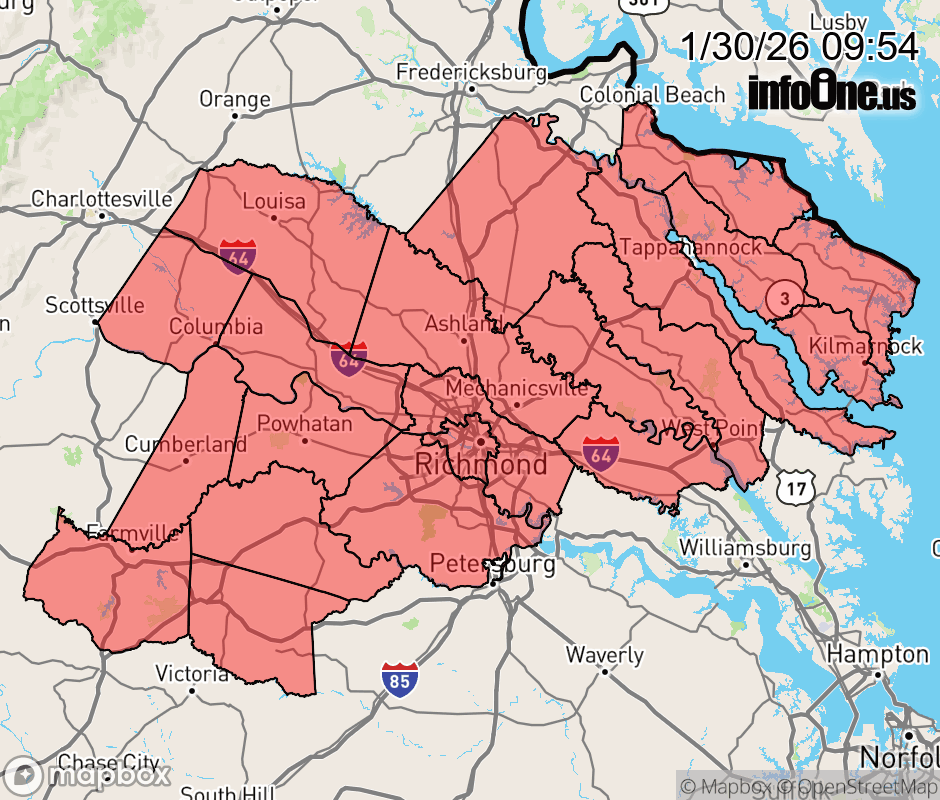 Canceled 1/30/26 2:20 PM Cold Weather Advisory issued January 30 at 9:52AM EST until February 1 at 1:00AM EST by NWS Wakefield VA * WHAT... For the Cold Weather Advisory, very cold wind chills as low as zero expected. For the Extreme Cold Watch, dangerously cold wind chills as low as 5 below possible. * WHERE... Portions of central, east central, eastern, north central, and south central Virginia. * WHEN... For the Cold Weather Advisory, from 1 AM Saturday to 1 AM EST Sunday. For the Extreme Cold Watch, from late Saturday night through Sunday morning. * IMPACTS... Frostbite and hypothermia will occur if unprotected skin is exposed to these temperatures. An extended period of freezing temperatures could cause ruptured water pipes. ![]() |