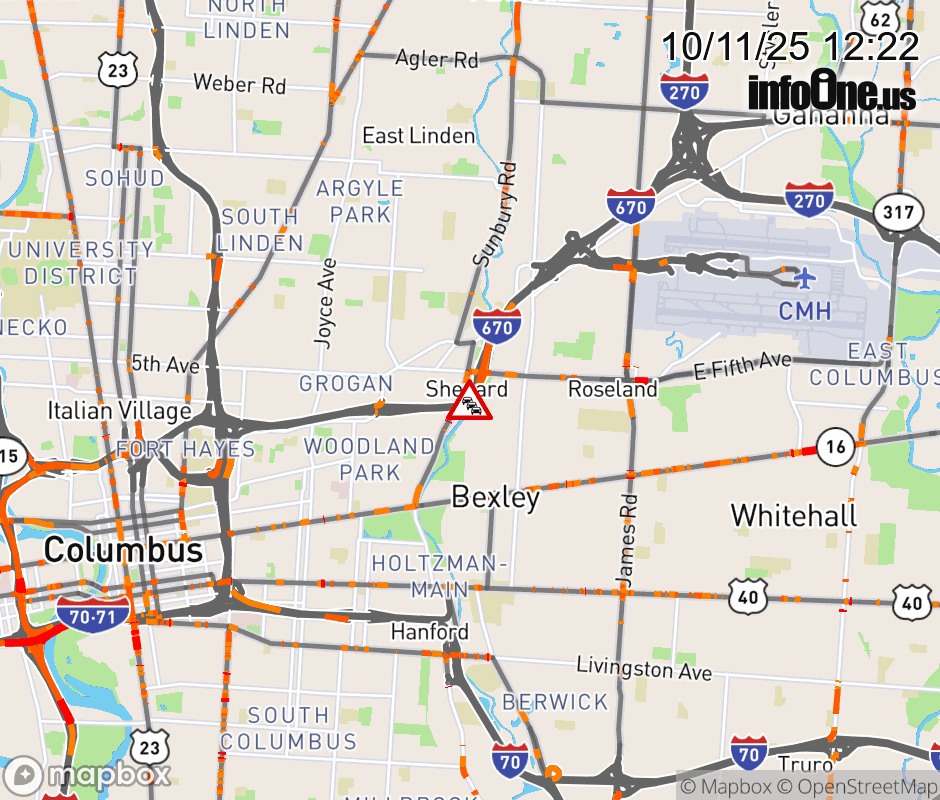 The 2 left lanes are blocked on I-670 East at US-62 West/Fifth Ave, due to repairs/maintenance. Updated: Sat 10/11/25 12:22 PM EDT ![]() Updated: Sat 10/11/25 12:22 PM EDT |