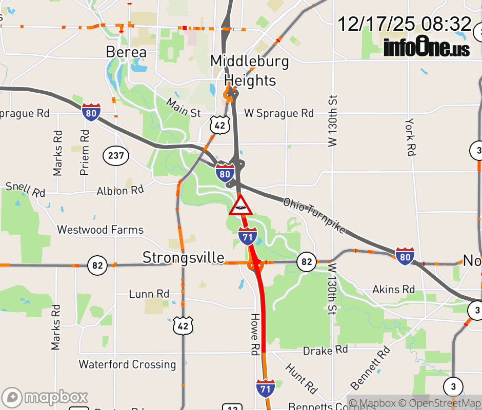 The right lane is blocked on I-71 North beyond SR-82/Royalton Rd, due to a crash. Updated: Wed 12/17/25 8:32 AM EST ![]() Updated: Wed 12/17/25 8:32 AM EST |
