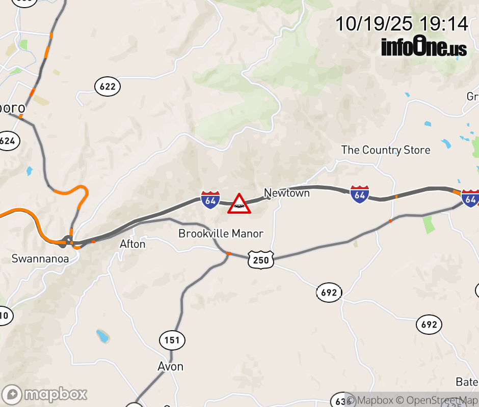On I-64 West at mile marker 103 in the County of Albemarle, motorists can expect delays due to a vehicle crash. Updated: Sun 10/19/25 7:14 PM EDT ![]() Updated: Sun 10/19/25 7:14 PM EDT |