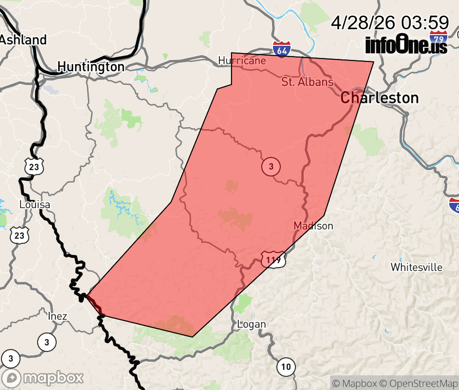 Canceled 4/28/26 4:15 AM Special Weather Statement issued April 28 at 3:58AM EDT by NWS Charleston WV At 358 AM EDT, Doppler radar was tracking strong thunderstorms along a line extending from near Culloden to Ranger to near Hode. Movement was east at 55 mph. HAZARD...Wind gusts up to 40 mph. SOURCE...Radar indicated. IMPACT...Gusty winds could knock down tree limbs and blow around unsecured objects. Locations impacted include... Charleston, Nitro, Madison, Hamlin, Jefferson, South Charleston, St. Albans, Dunbar, Hurricane, Chapmanville, Ranger, Hode, Spurlockville, Institute, Tornado, Harts, Cross Lanes, Gill, Alum Creek, and Julian. This includes the following highways... Interstate 64 in West Virginia between mile markers 32 and 34, and between mile markers 45 and 55. Route 119 between mile markers 32 and 43, and between mile markers 48 and 77. ![]() |